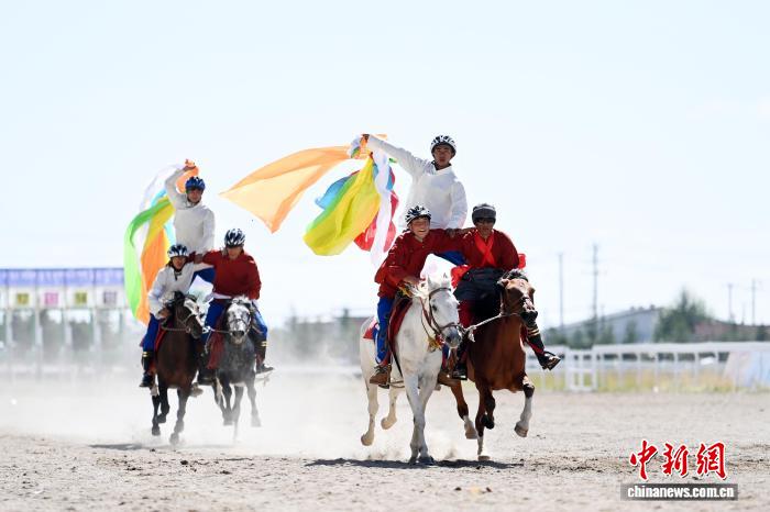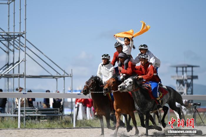 8月13日,九色甘南香巴拉·瑪曲第十六屆格薩爾賽馬會在甘肅甘南藏族自治州瑪曲縣格薩爾賽馬中心開幕。來自貴州、西藏、青海、四川、甘肅等省區(qū)的45支參賽隊(duì)962匹駿馬在瑪曲草原上展開為期5天的角逐。圖為開幕式現(xiàn)場馬術(shù)表演。中新社記者 九美旦增 攝