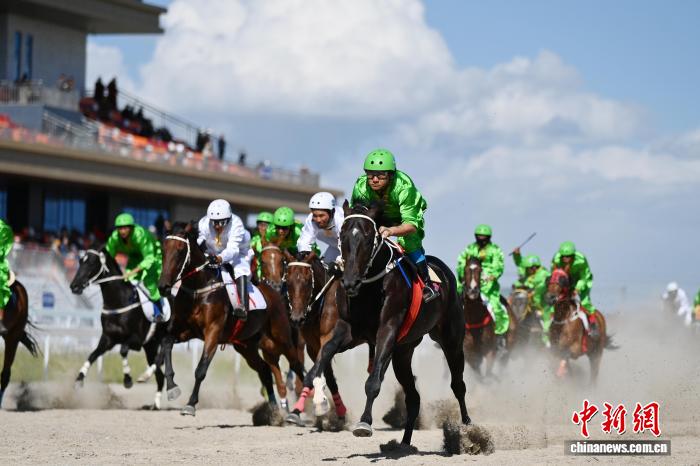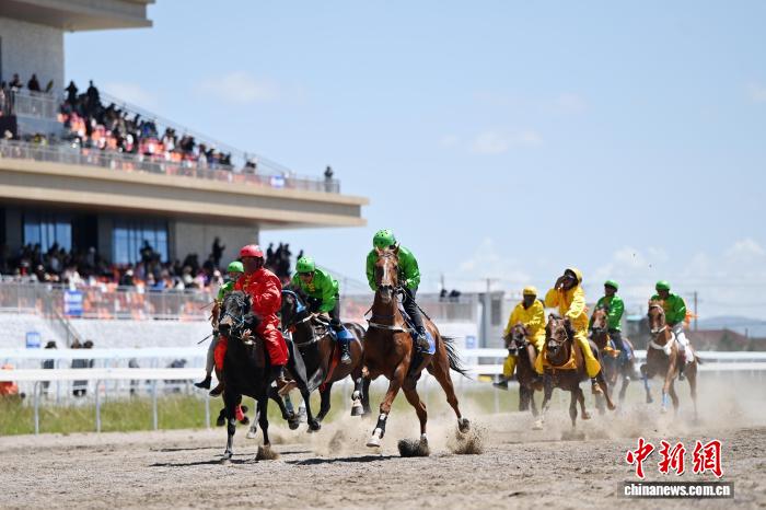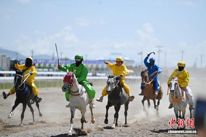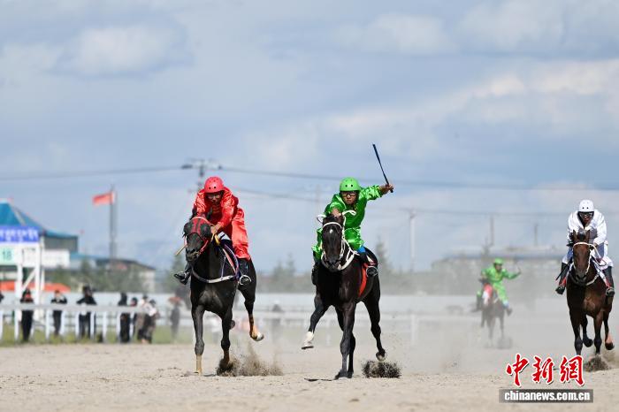 圖為賽馬選手在格薩爾賽馬中心比賽中。中新社記者 九美旦增 攝