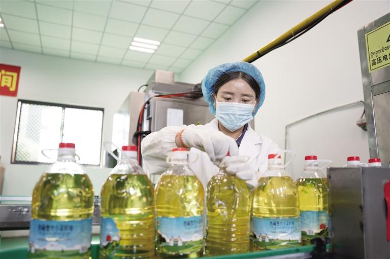 2023年建成的小油菜榨油廠(二期)總投資3000萬元,配備吹瓶機(jī)、灌裝機(jī)等全套現(xiàn)代化設(shè)備。從一期半自動(dòng)生產(chǎn)實(shí)現(xiàn)跨越式升級(jí),達(dá)成“全自動(dòng)標(biāo)準(zhǔn)化生產(chǎn)”。次旦央珍介紹:“目前,我們廠年均加工能力可覆蓋近3萬畝油菜籽,從 ‘一粒油菜籽’到‘一桶精制油’ 的轉(zhuǎn)化效率大幅提升,為產(chǎn)業(yè)規(guī)?;?、產(chǎn)業(yè)化發(fā)展提供了堅(jiān)實(shí)的產(chǎn)能支撐?!?/p>