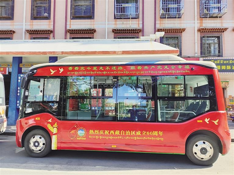 除此之外,W03微循環(huán)公交車的車身、車頭、車內(nèi)等顯眼位置,都精心張貼了藏漢雙語宣傳標語、海報及大慶標識;車尾的LED顯示屏還循環(huán)播放著“慶祝西藏自治區(qū)成立60周年”公益宣傳片,進一步營造了濃厚的慶祝氛圍。這些宣傳內(nèi)容簡潔有力、直擊人心,生動地表達了西藏人民對黨的感恩之情,以及對西藏自治區(qū)成立60周年的衷心祝福。