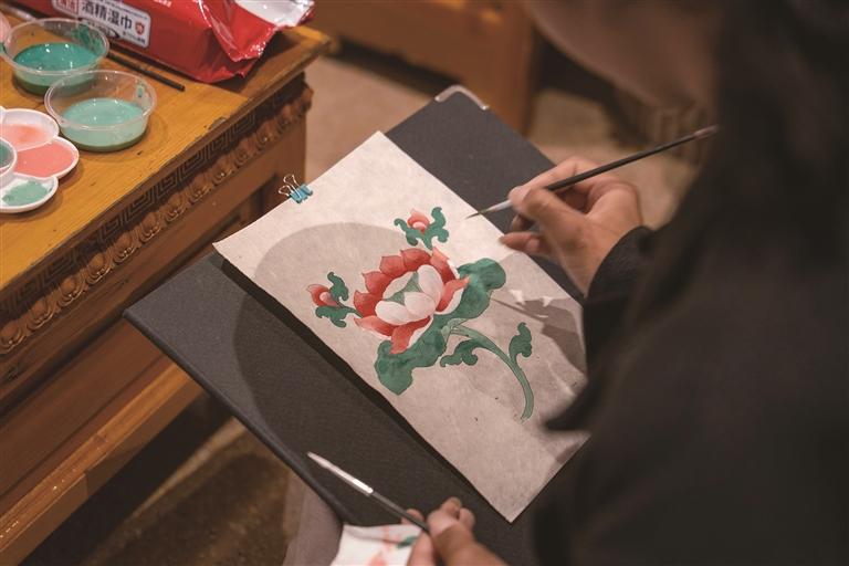市民、游客現(xiàn)場體驗唐卡繪制。