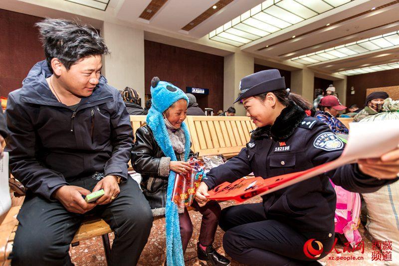 按照“平安出行、有序出行、溫馨出行”工作目標(biāo),拉薩鐵路公安處組織全處各單位干部民警共計(jì)60余人分別在西藏各火車站,緊緊圍繞“服務(wù)旅客為宗旨,待旅客如親人”的理念,開展了春運(yùn)首日暨“一路溫馨一路情 天路鐵警伴您行”主題系列活動(dòng)。圖為拉薩鐵路公安處民警(右一)向“小旅客”發(fā)放春聯(lián)。圖片來(lái)源:人民網(wǎng)