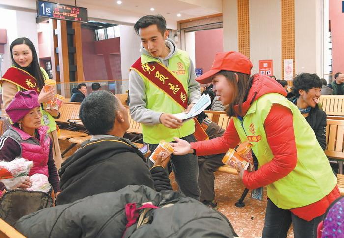 拉薩火車站團(tuán)委聯(lián)合中國(guó)移動(dòng)西藏公司開展“黨團(tuán)志愿者愛心送溫暖 服務(wù)春運(yùn)返鄉(xiāng)農(nóng)民工”主題活動(dòng),一個(gè)個(gè)黨團(tuán)員志愿者的身影在候車室里忙碌著。圖為2月1日,中國(guó)移動(dòng)西藏公司的志愿者正在拉薩火車站候車室給旅客發(fā)放奶茶、礦泉水。 圖片來(lái)源:西藏日?qǐng)?bào) 李洲 攝