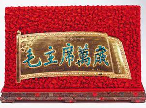 圖為金盾:毛主席萬歲。1951年5月,十世班禪大師敬獻(xiàn)毛澤東主席的禮品。金盾主體部分的五星紅旗是銅質(zhì)鍍金,珍珠鑲嵌旗面周圍,綠松石鑲嵌字體,右側(cè)藏文為“班禪額爾德尼敬獻(xiàn)”。圖片來源:民族文化宮 許娜攝