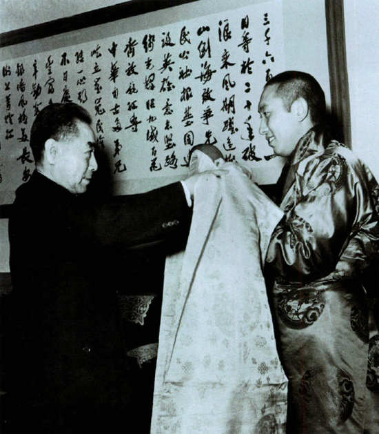 圖為十世班禪額爾德尼向周總理敬獻哈達。攝影:金持元