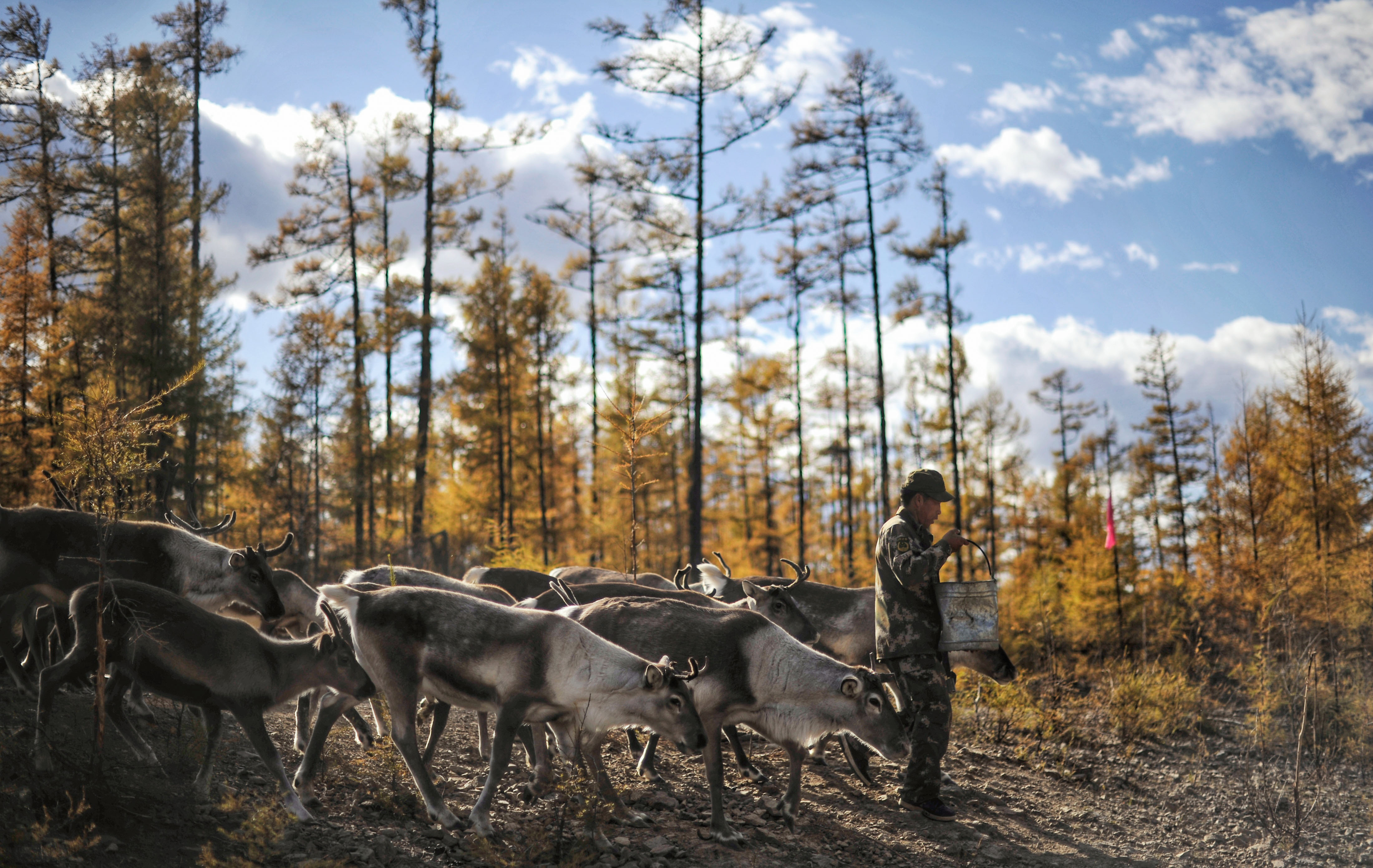 內(nèi)蒙古大興安嶺根河林業(yè)局約安里林場,林場職工張國華為馴鹿補(bǔ)充飼料。