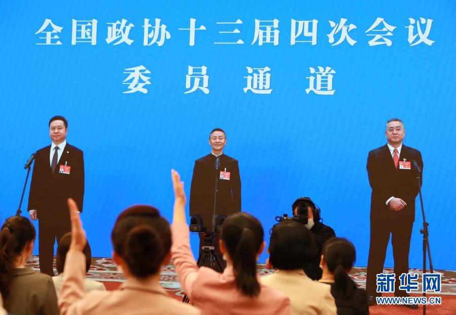 3月10日,全國政協(xié)十三屆四次會議在北京人民大會堂新聞發(fā)布廳舉行第三場“委員通道”采訪活動。這是記者(屏幕中手持話筒者)通過網(wǎng)絡(luò)視頻方式提問。新華社記者 王南 攝