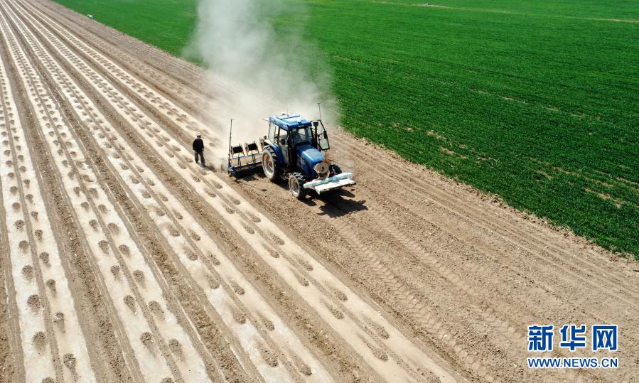 在新疆生產(chǎn)建設(shè)兵團(tuán)第六師共青團(tuán)農(nóng)場,一臺(tái)安裝北斗導(dǎo)航自動(dòng)駕駛系統(tǒng)的播種機(jī)在播種棉花(2020年4月8日攝,無人機(jī)照片) 。新華社發(fā)(李華北 攝)