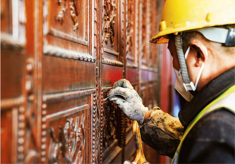 位于上海市興業(yè)路76號的中共一大會址紀(jì)念館實(shí)施修繕改造。圖為2021年3月22日,工人在清理木質(zhì)雕花板?!⌒氯A社記者 劉穎/攝