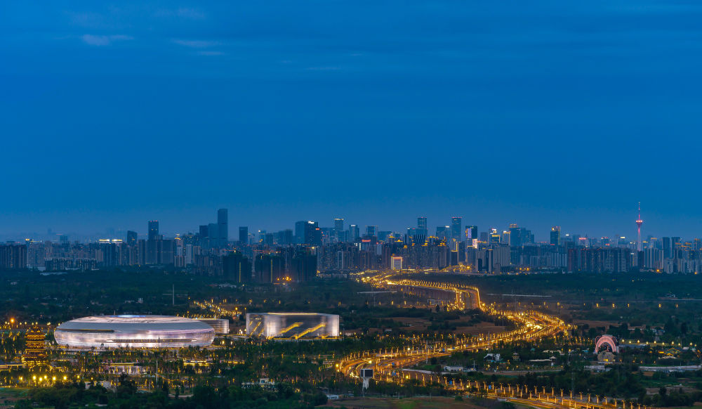 從龍泉山俯瞰夜幕下的東安湖體育公園(7月23日攝),成都大運(yùn)會(huì)開幕式將于28日晚在此舉行。新華社發(fā)(廖鐵軍攝)
