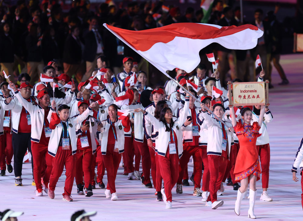 7月28日,印度尼西亞大學生體育代表團在開幕式上入場。新華社記者 張麗蕓 攝