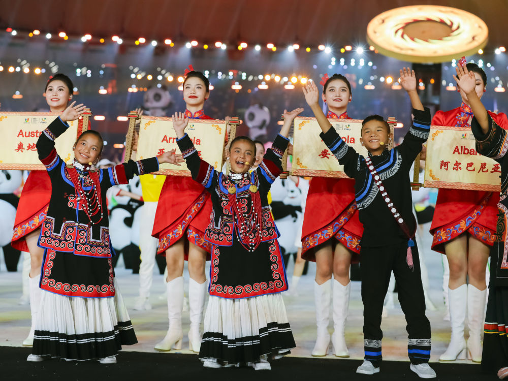 7月28日,來自四川涼山彝族自治州的孩子們?cè)诔啥即筮\(yùn)會(huì)開幕式上歌唱。新華社記者 陳澤國 攝