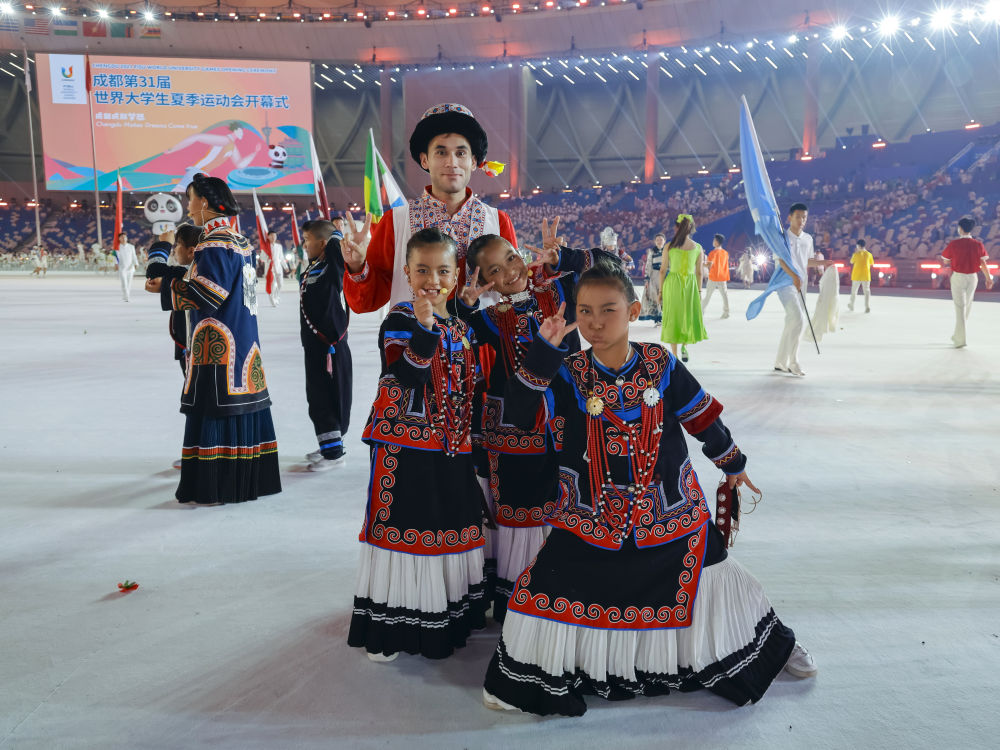 7月23日,在成都大運(yùn)會(huì)開幕式彩排結(jié)束后,俄地惹漢、馬杰英和吉和拉作(前左至右)與來自新疆的塔吉克族演員拍攝合影。新華社記者沈伯韓 攝