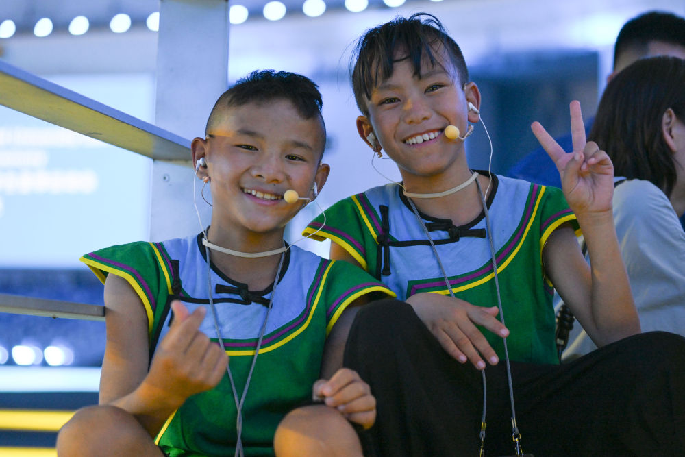 7月16日,在成都大運(yùn)會(huì)開幕式彩排現(xiàn)場拍攝的候場中的吉子醫(yī)生(左)和吉朵史拉(右)。新華社記者胥冰潔 攝