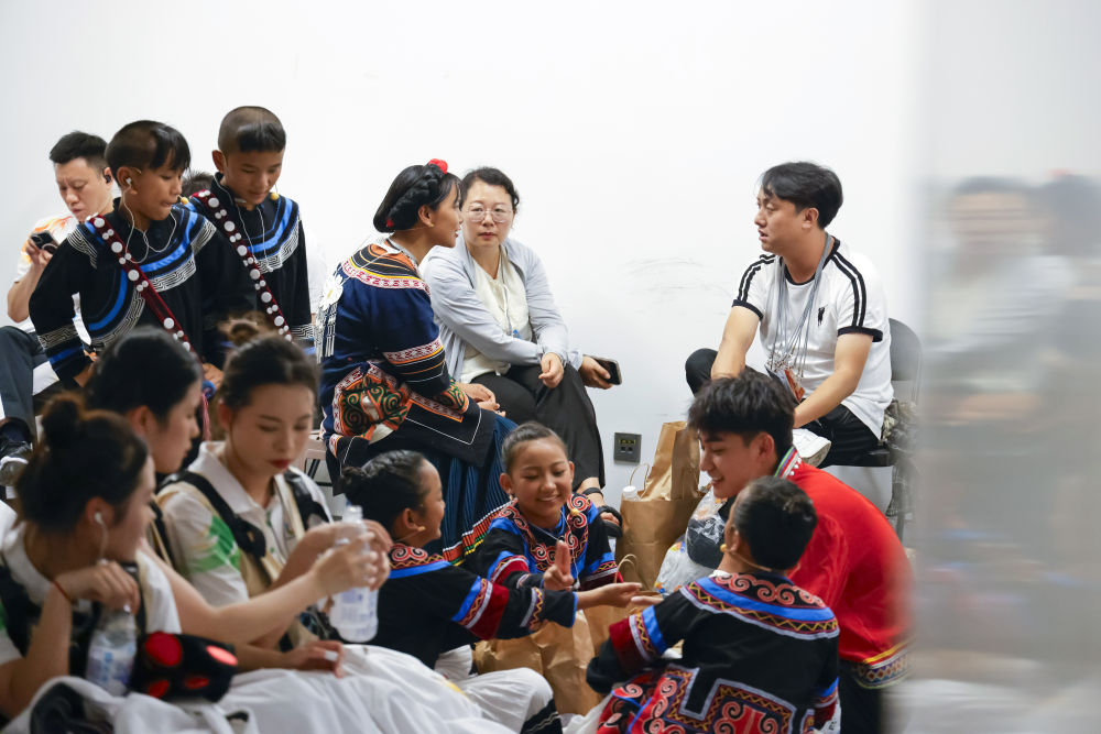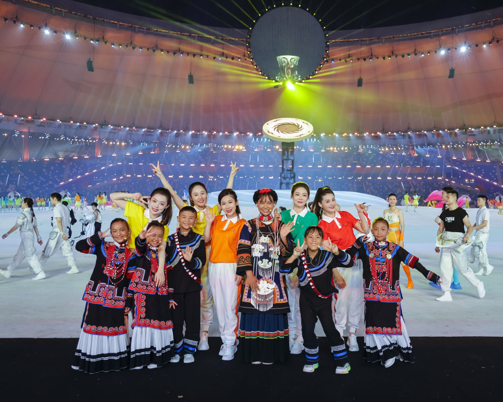 7月23日,成都大運(yùn)會(huì)開幕式彩排結(jié)束后,一些演員主動(dòng)和來自大涼山的孩子們拍攝合影。新華社記者 沈伯韓 攝