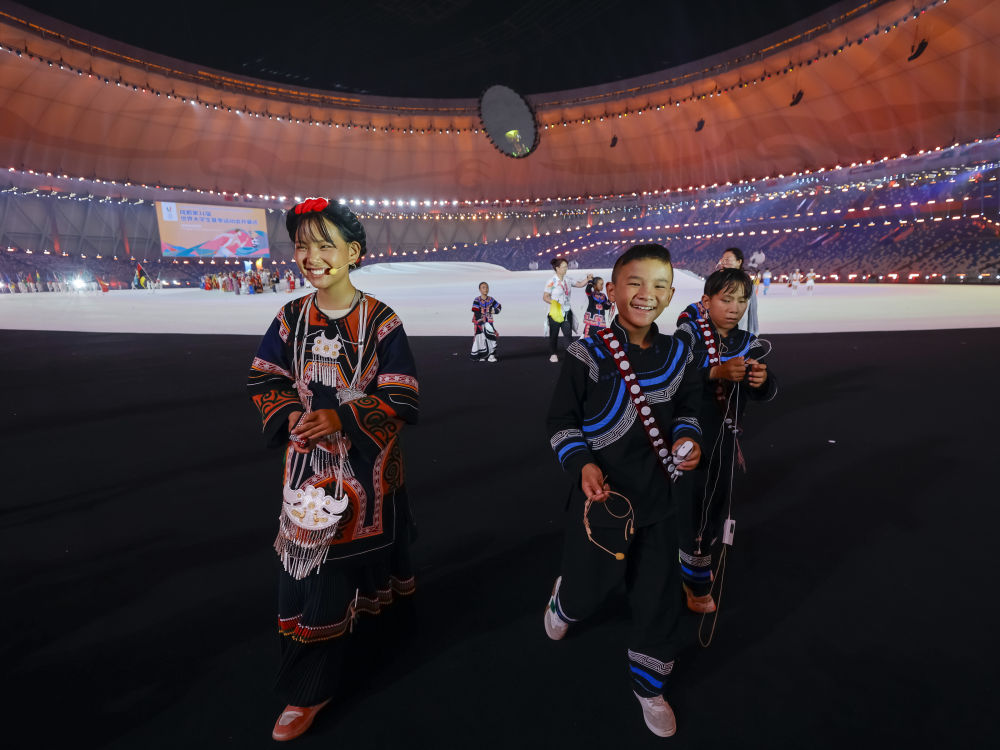 7月28日,來自四川涼山彝族自治州的孩子們?cè)诔啥即筮\(yùn)會(huì)開幕式上歌唱。新華社記者 江宏景 攝