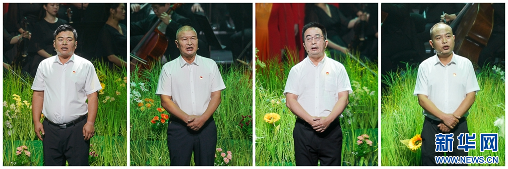 7月17日晚上,來自基層的村干部鞏保雄(左一)、高泉偉(左二)、俞小平(右二)和施金通(右一)走上舞臺,深情講述《新時代——我做鄉(xiāng)村振興答卷人》。新華網 肖和勇 攝